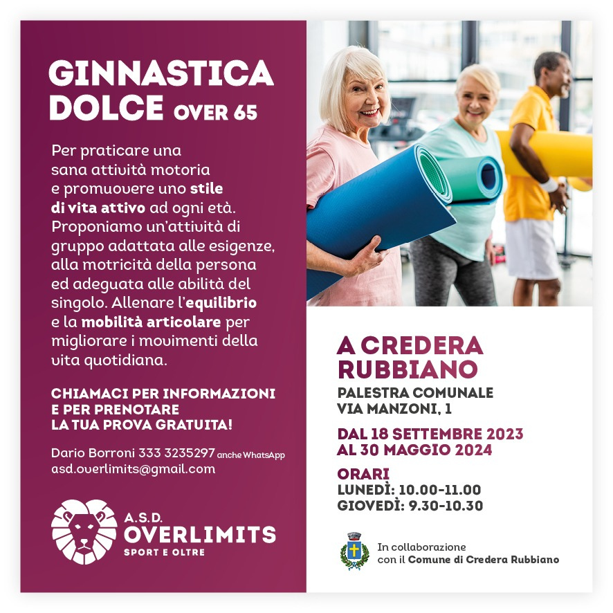 Da Lunedì 18 Settembre 2023, in collaborazione con A.S.D.OVERLIMITS presso la Palestra Comunale del Centro Sportivo di Credera Rubbiano, parte il corso di ginnastica dolce per praticare una sana attività motoria e promuovere uno stile di vita attivo ad ogni età.