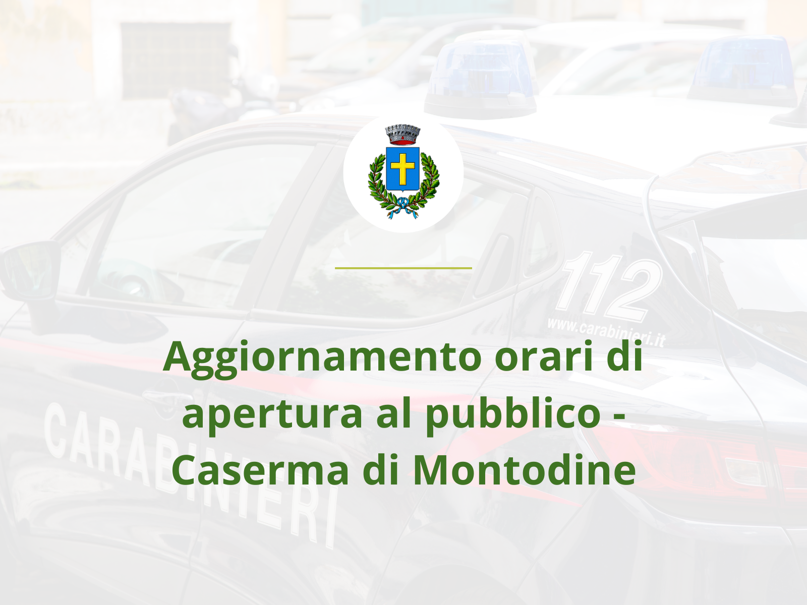 Si condivide con la cittadinanza che dal 5 Agosto 2024 l'orario di apertura al pubblico della Caserma di Montodine sarà tutti i giorni (compresi Domenica e festivi) dalle ore 9.00 alle ore 13.00 e dalle ore 13.30 alle ore 17.30.