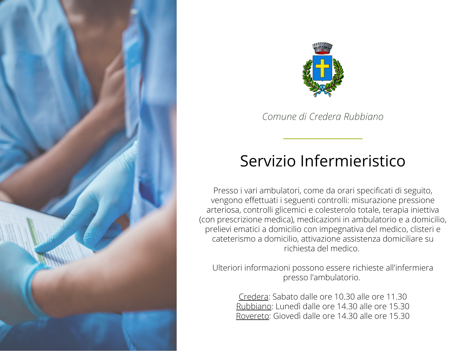 Presso i vari ambulatori, come da orari specificati di seguito, vengono effettuati i seguenti controlli: misurazione pressione arteriosa, controlli glicemici e colesterolo totale, terapia iniettiva (con prescrizione medica), medicazioni in ambulatorio e a domicilio, prelievi ematici a domicilio con impegnativa del medico, clisteri e cateterismo a domicilio, attivazione assistenza domiciliare su richiesta del medico.