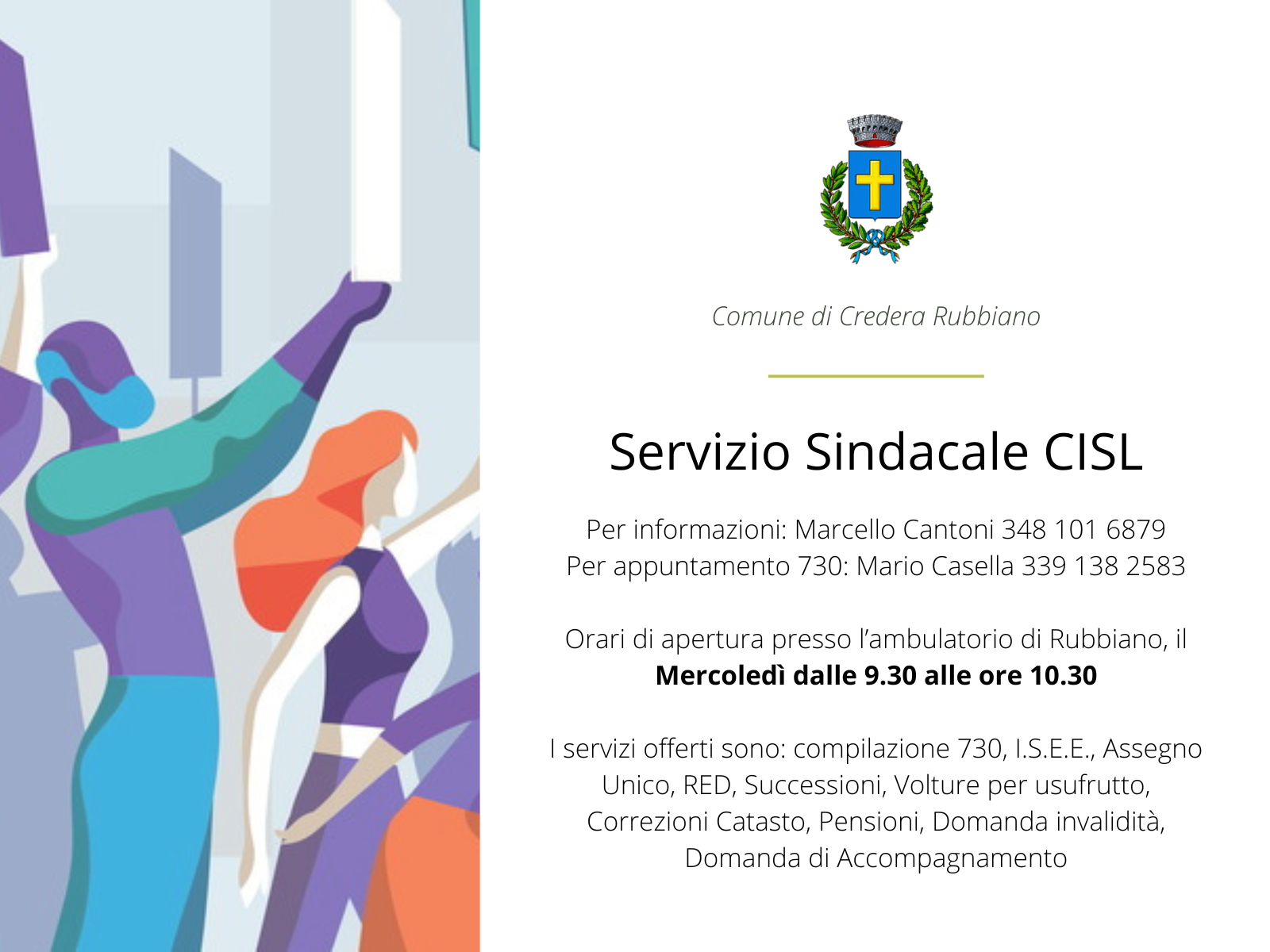I servizi offerti sono: compilazione 730, I.S.E.E., Assegno Unico, RED, Successioni, Volture per usufrutto, Correzioni Catasto, Pensioni, Domanda invalidità, Domanda di Accompagnamento