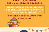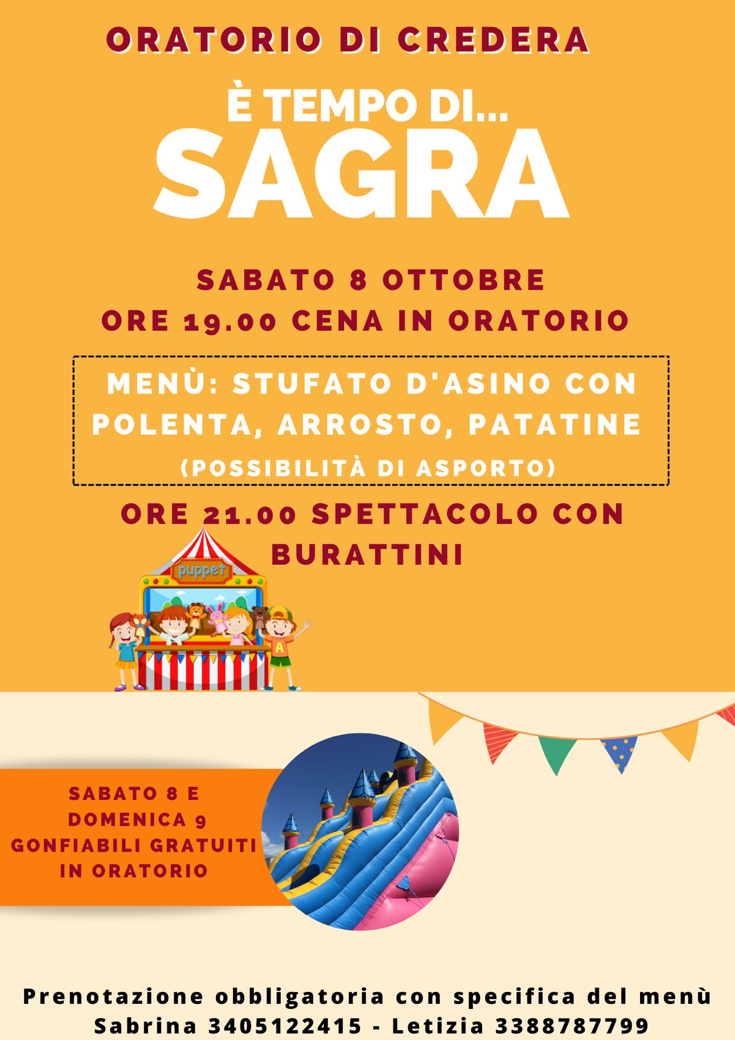 Sabato 8 Ottobre alle ore 19.00, l'Oratorio di Credera organizza la Cena in Oratorio con un menù (disponibile anche d'asporto) composto da stufato d'asino con polenta, arrosto, patatine. Alle ore 21.00, ci sarà lo spettacolo con i burattini.